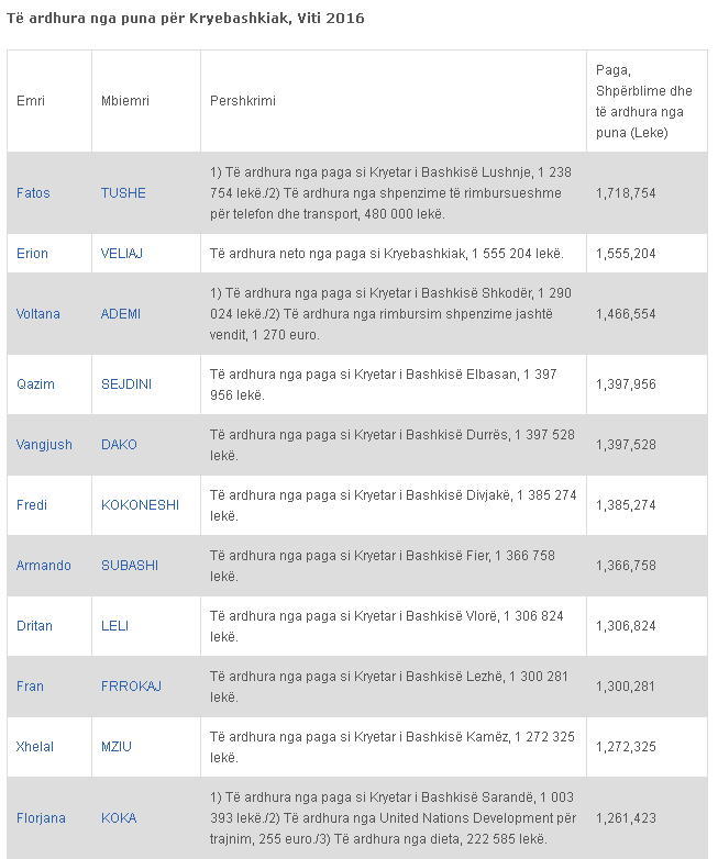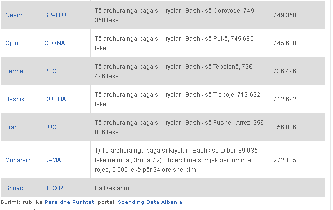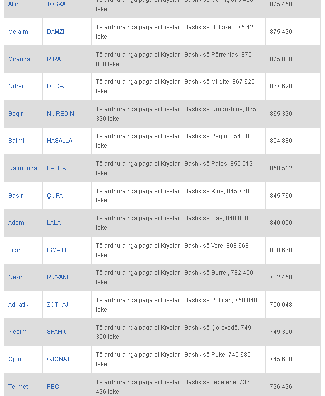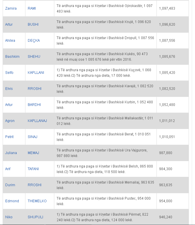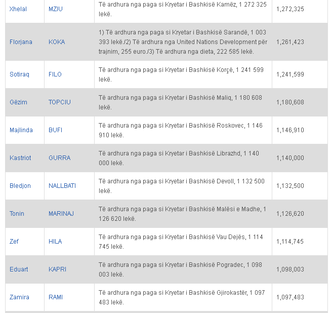 Në krye të listës me të ardhura më të larta është kreu i bashkisë së Vorës, Fiqiri Ismaili, ndërsa në fund të listës është kreu i bashkisë së Fushë Arrëzit, Fran Tuçi.