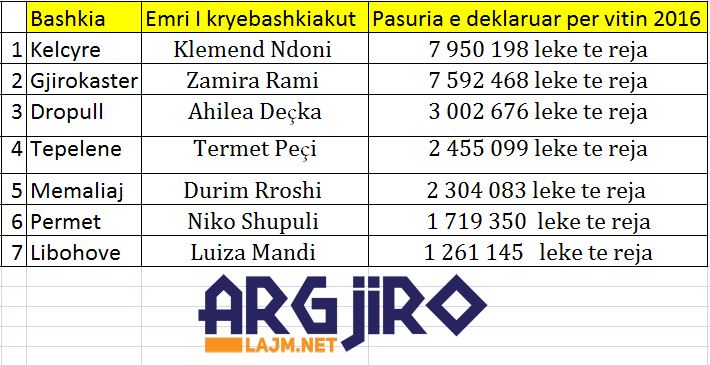 ArgjiroLajm.net ka raportuar gjatë javës që shkoi mbi pasuritë e deklaruara për vitin 2016 nga kryebashkiakët e qarkut Gjirokastër. Sot do të sjellim një renditje nga kryebashkiaku më i pasur tek më i varfëri, duke iu referuar gjithnjë deklaratës së pasurisë së bërë nga ata vetë në ILDKPI. Pra, kriteri për këtë renditje është thjesht vlera e pasurisë së deklaruar gjatë vitit 2016 nga secili kryebashkiak, ku përfshihet pasuria në emrin e tyre personal dhe të familjarëve.