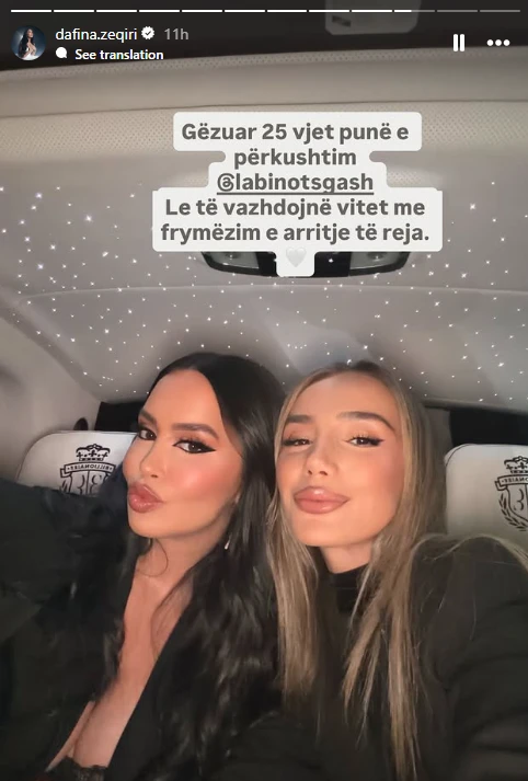 Por jo vetëm kaq. Dafina jo vetëm që mori pjesë në festë, por zgjodhi edhe ta uronte publikisht Labin përmes një story në Instagram. Krahas një fotoje me grimieren e saj, Dafina Neziri, këngëtarja shkroi: