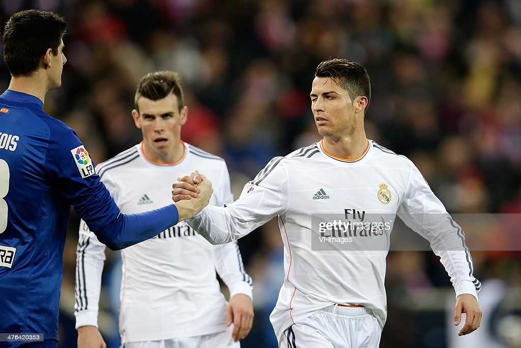 (L-R) Thibaut Courtois of Atletico Madrid, Cristiano Ronaldo of Real Madrid during the Spanish Primera División match between Atletico Madrid and Real Madrid at Estadio Vicente Calderón on march 2, 2014 in Madrid, Spain.(Photo by VI Images via Getty Images)
