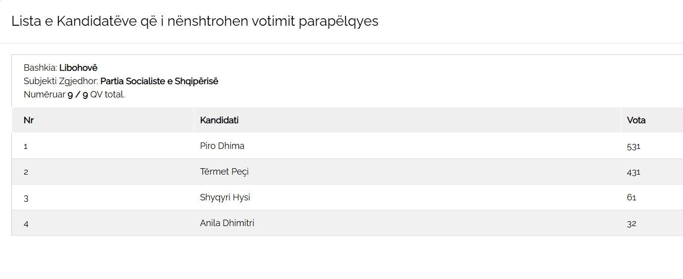 Në ndarjen e votave mes kandidatëve të listës së hapur në Bashkinë Libohovë, Piro Dhima i Partisë Socialiste ka marrë numrin më të madh. I dyti renditet Tërmet Peci. I treti Shyqyri Hysi dhe e fundit Anila Dhimitri. Ndërsa në listën e kandidatëve të PD-së, Arben Ristani është renditur i pari. E dyta është Alma Kore. Më poshtë tabelat me rezultatin e plotë.