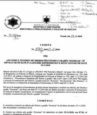 Më datë 13 nëntor, drejtori i Përgjithshëm i Policisë së Shtetit firmosi një urdhër për anulimin e testimit me shkrim për fitimin e gradës “Komisar”, të zhvilluar më datë 7 nëntor dhe ripërsëritjen e këtij testimi më datë 15 nëntor. “Bazuar në ligjin për Policinë e Shtetit, në Rregulloren e Policisë së Shtetit, në urdhrat e Drejtorit të Përgjithshëm të Policisë nr.975 për miratimin e procedurës standarde të fitimit të gradës dhe nr.871 për hapjen e procesit të konkurrimit për fitimin e gradës policore ‘Komisar’, ‘Kryekomisar’ dhe ‘Drejtues’, si dhe në Memon e Drejtorisë së Standardeve Profesionale.