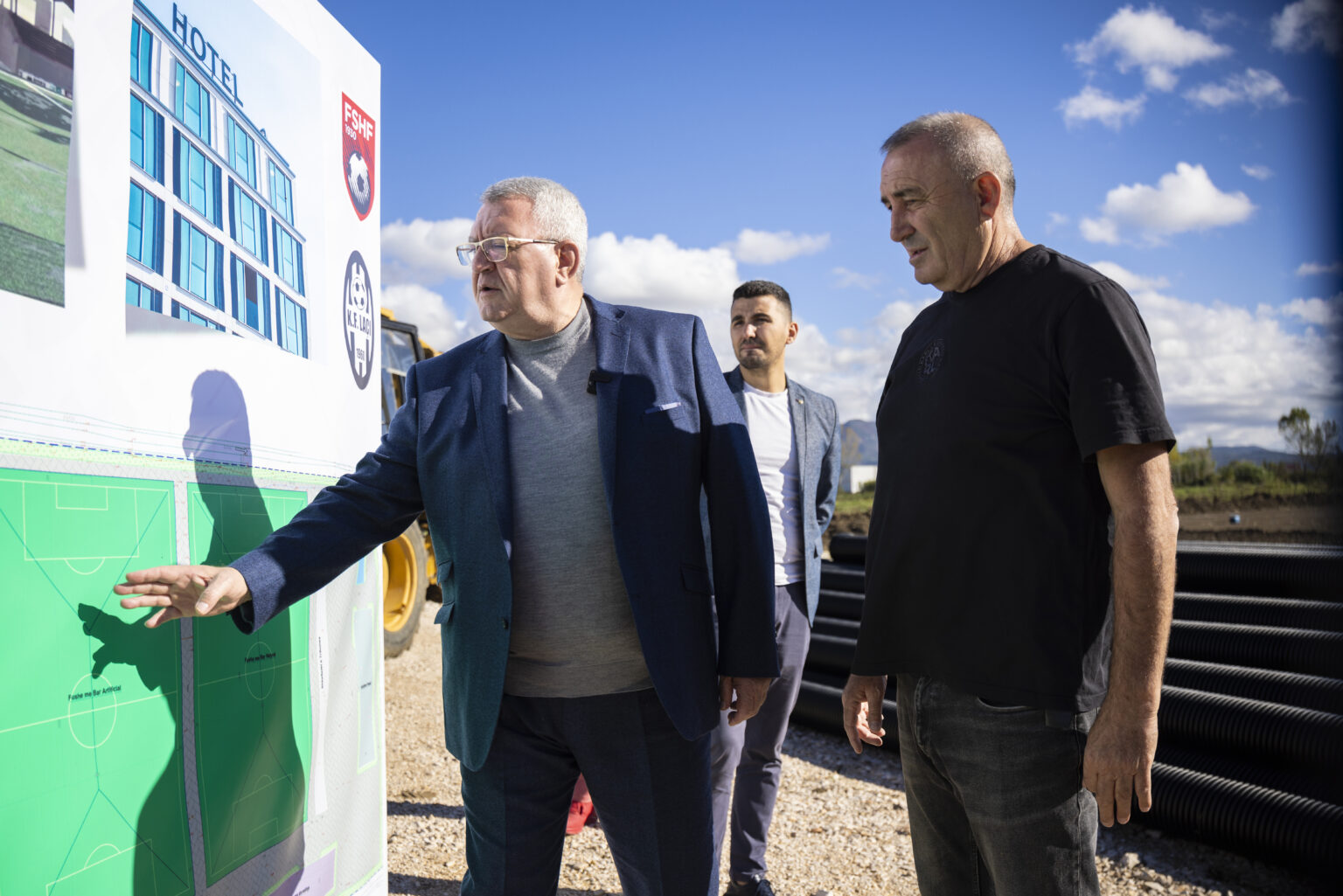 “Është një investim 100% i futbollit. Një bashkëpunim i FSHF-së dhe klubit Laçi. Puna ka filluar, siç e shihni me bazamentet dhe me ndryshimin e terrenit. Jemi në fazën kur do të fillojë sistemi i drenazhimit. Objektivi bashkë me Presidentin e klubit të Laçit, z. Pashk Laska, është që në muajin qershor të fillojnë të stërviten fëmijët në këtë kompleks.
