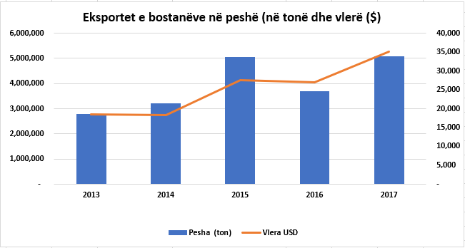 Ekpsortet e bostanorëve kanë qenë në rritje në 2017-n (shiko grafikun). Sipas të dhënave u eksportuan 33 mijë e 344 tonë bostanë jashtë me një vlerë prej 5.2 miliardë dollarë. Vendi që ka sasinë më të madhe të eksportuar të bostanëve nga shqipëria në 2017-n është Serbia, me një vlerë prej 1.7 milionë dollarë, në vend të dytë është Ccekia me 1.3 milionë dollarë. Më pas renditen vendet e rajonit si Bosnja 751 mijë dollarë, Kroacia me 359 dollarë dhe Maqedonia me 312 mijë dollarë.