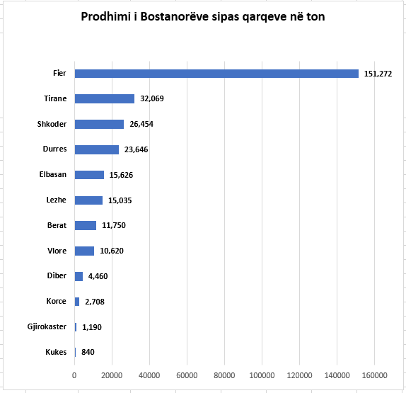 Qarku me prodhimin më të lartë të bostanit është Fieri, ku sipas të dhënave të publikuara nga Instat në vjetarin statistikor të bujqësisë, në Fier gjatë 2017-s u prodhuan 151 mijë e 272 tonë bostanë. Qarku i Fierit përgjigjet për më shumë se gjysmën e prodhimit kombëtarë të bostanëve në vend.