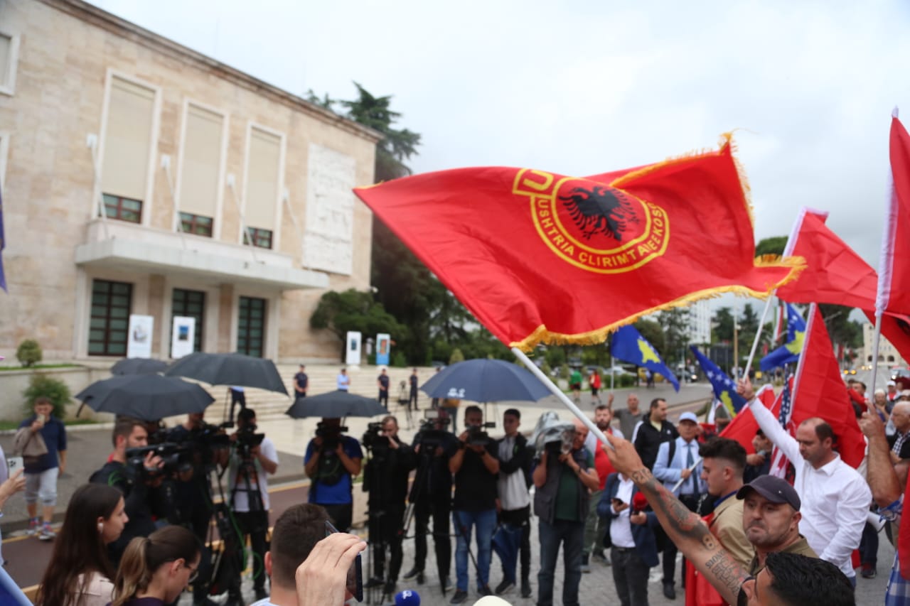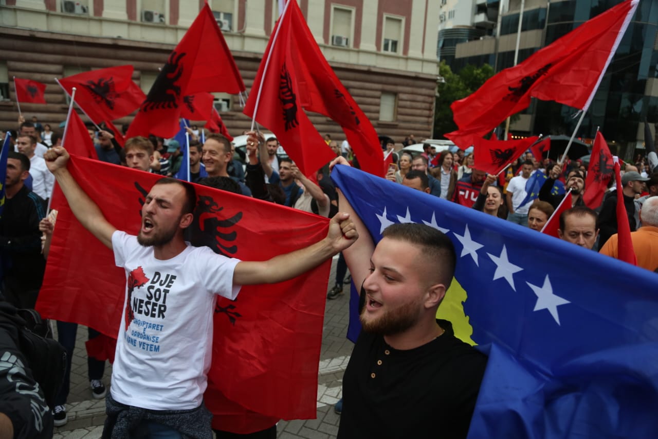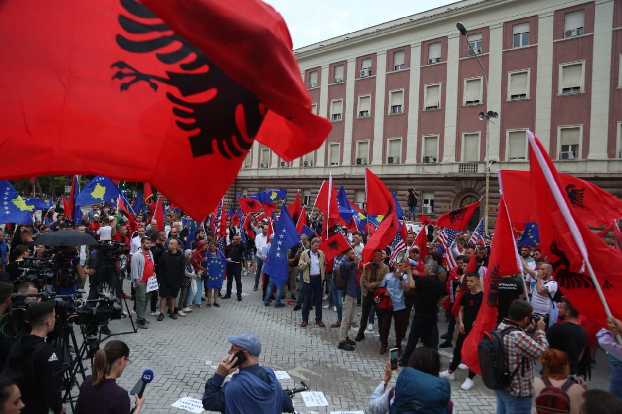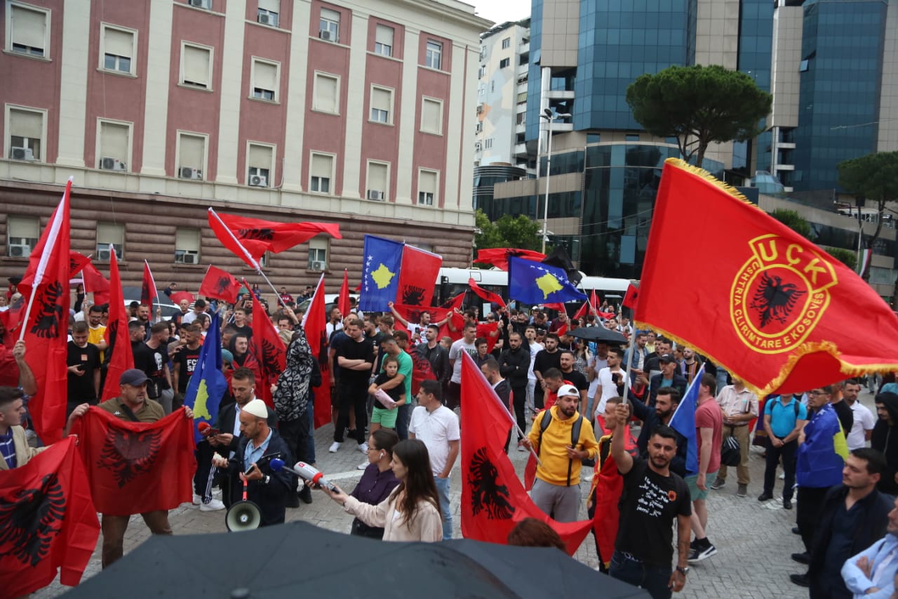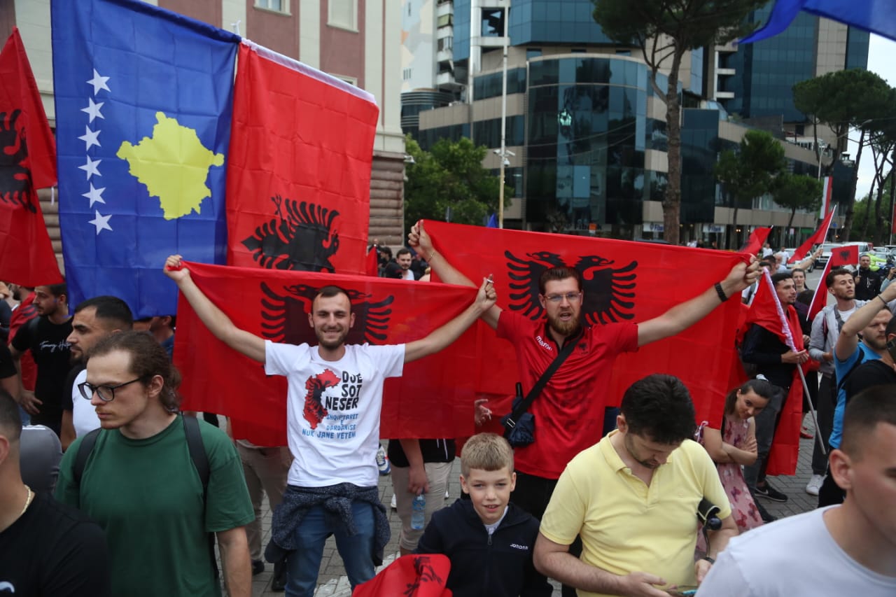 Me flamujt e Shqipërisë dhe Kosovës në duar, ata kërkojnë më shumë mbështetje nga qeveria e Shqipërisë për Kosovën.