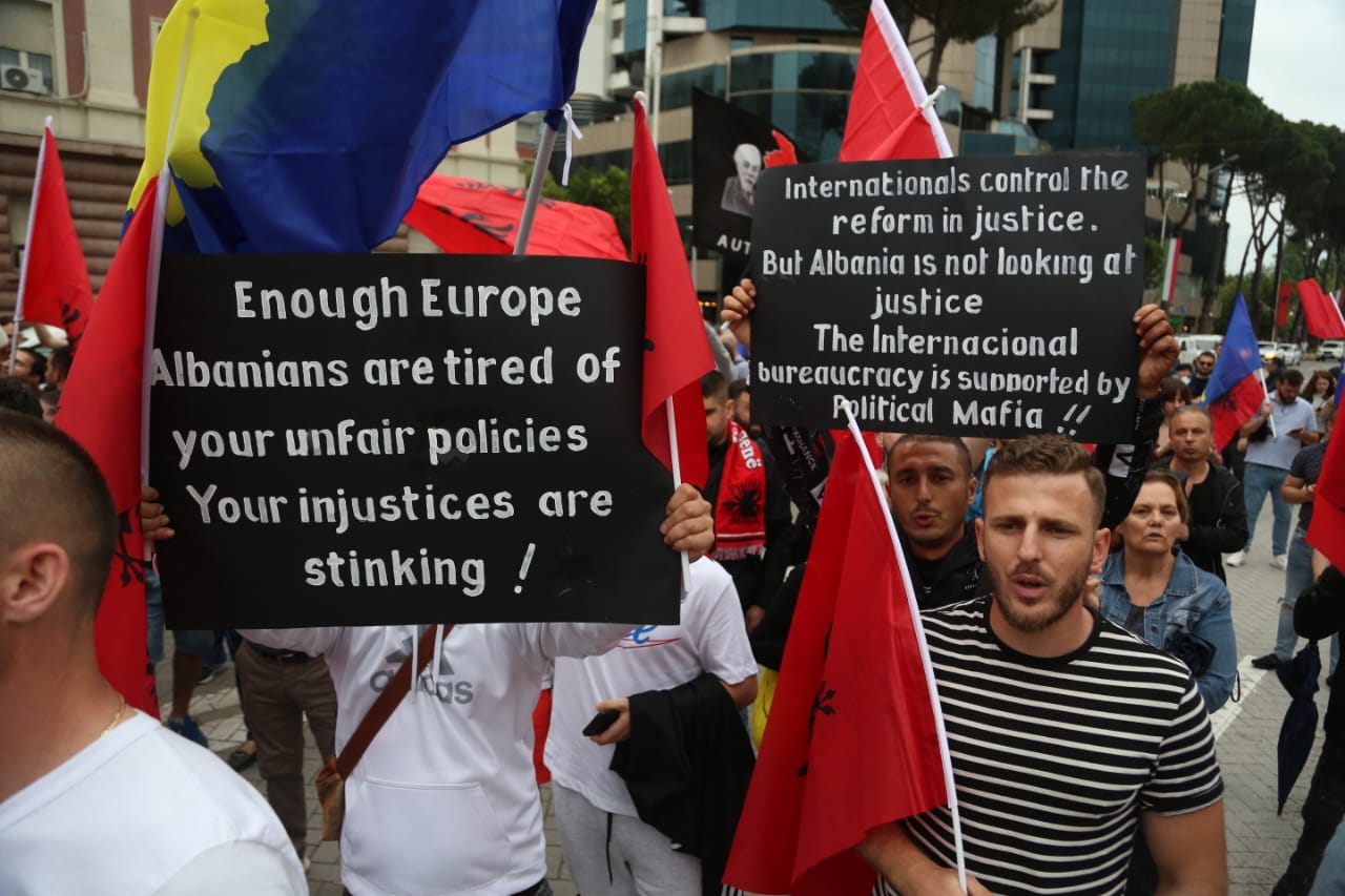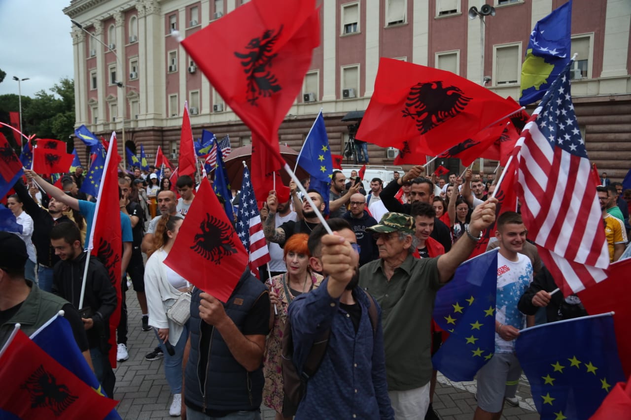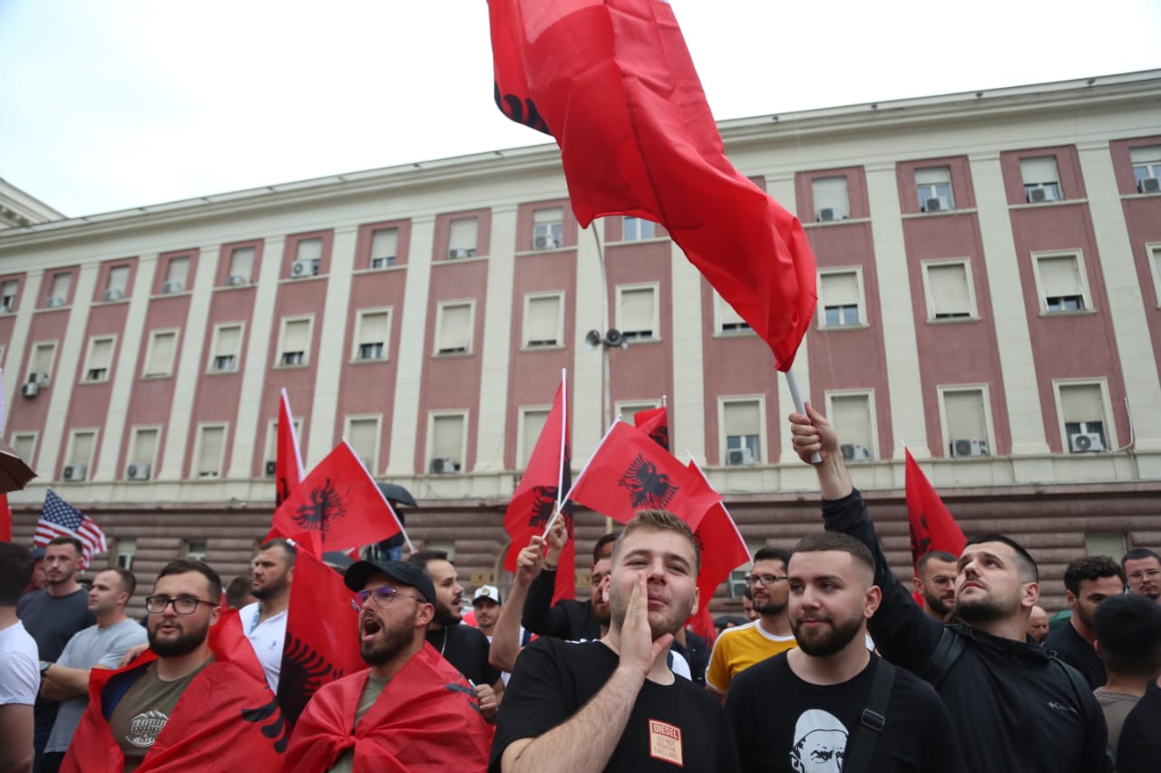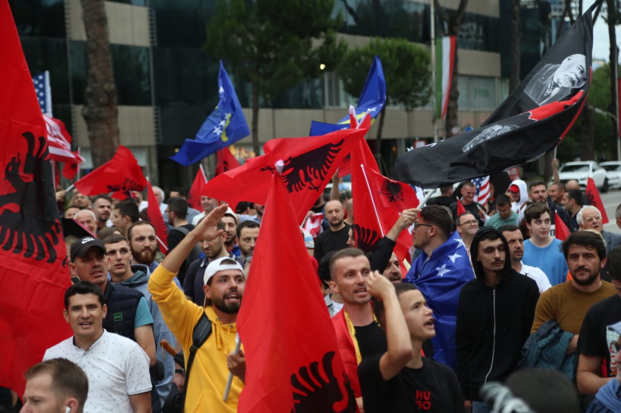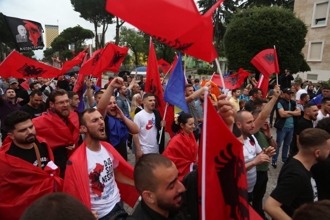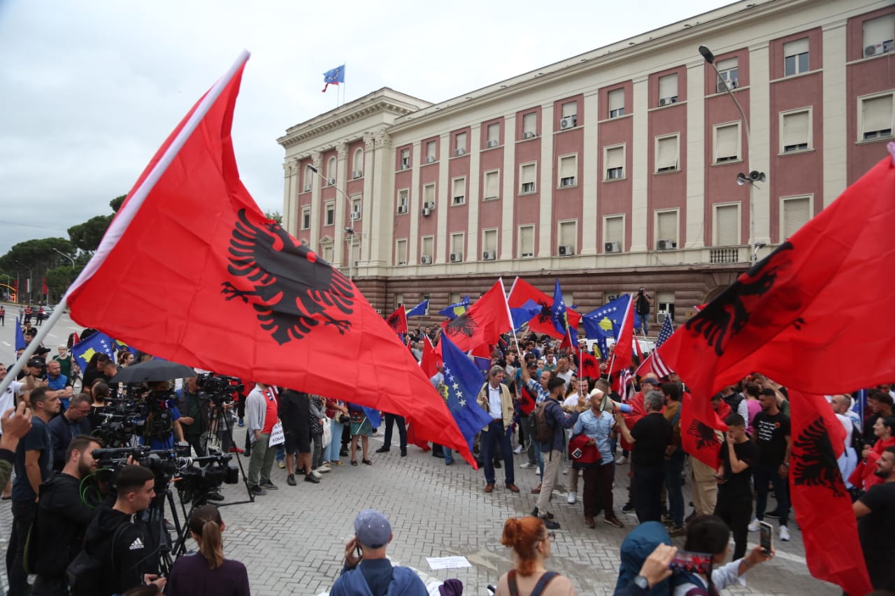 Me flamujt e Shqipërisë dhe Kosovës në duar, ata kërkojnë më shumë mbështetje nga qeveria e Shqipërisë për Kosovën.