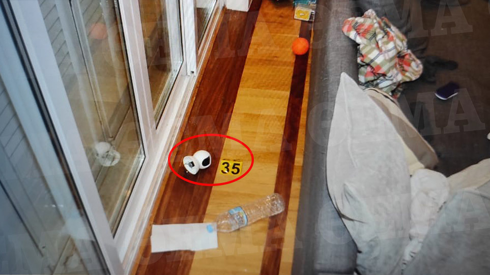 Kamera, ose prova numër 35 duket e hedhur pas divanit në dhomën e ndjenjës. Përpara se ta thyente, Anagnostopoulos i kishte hequr kamerës edhe kartën e memories rreth orës 1.20 të natës, thuajse dy orë përpara se t’i merrte jetën Caroline-s.
