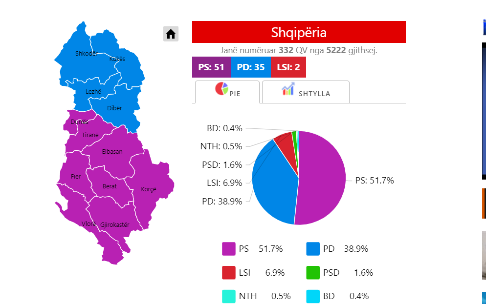 Procesi i numërimit në Shqipëri për zgjedhjet e 25 prillit vijon teksa janë numëruar 326 kuti. PS kryeson në mbi 300 kutitë e para duke marrë 51.5% të votave, ose ndryshe 41 mijë e 975 vota. PD nga ana tjetër ka 39.1% të votave ose 31 mijë e 849 vota kurse LSI me 6.9% ka 5 mijë e 612 vota. Me votat e tanishme përkthyer në mandate PS i takojnë 46 deputetë, PD 32 dhe LSI 3.
