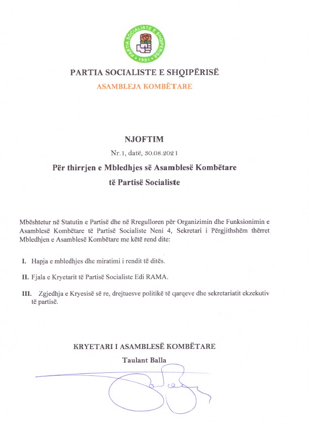 Mbështetur në Statutin e Partisë dhe në Rregulloren për Organizimin dhe Funksionimin e Asamblesë Kombëtare të Partisë Socialiste Neni 4, Sekretari i Përgjithshëm thërret Mbledhjen e Asamblesë Kombëtare me këtë rend dite:
