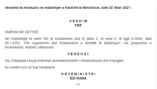Enkelejda Muçaj është emëruar zëvendësministre e Infrastrukturës dhe Energjisë. Vendimi është marrë në mbledhjen e sotme të Këshillit të Ministrave nga kreu i qeverisë Edi Rama. Vendimi është publikuar në faqen online të Kryeministrisë.