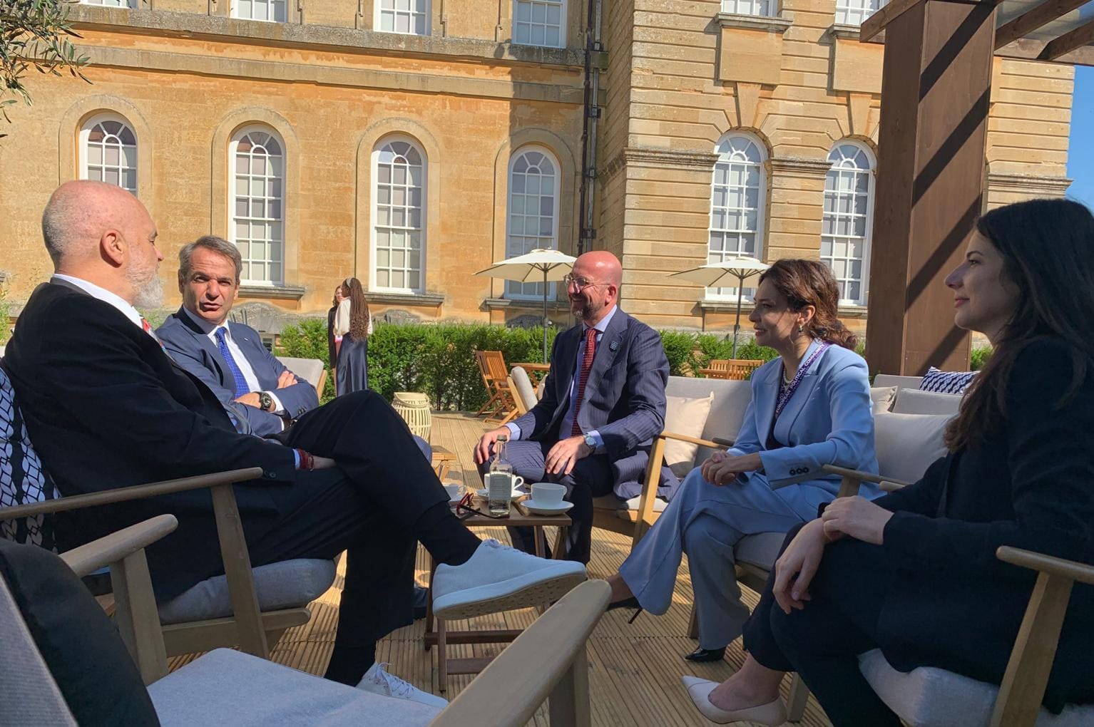 “Blenheim Palace, Mbretëria e Bashkuar Në margjina të Samitit të Komunitetit Politik Europian, me Presidentin e Këshillit Europian, Charles Michel dhe kryeministrin e Greqisë, Kyriakos Mitsotakis”, shkruan ministrja.