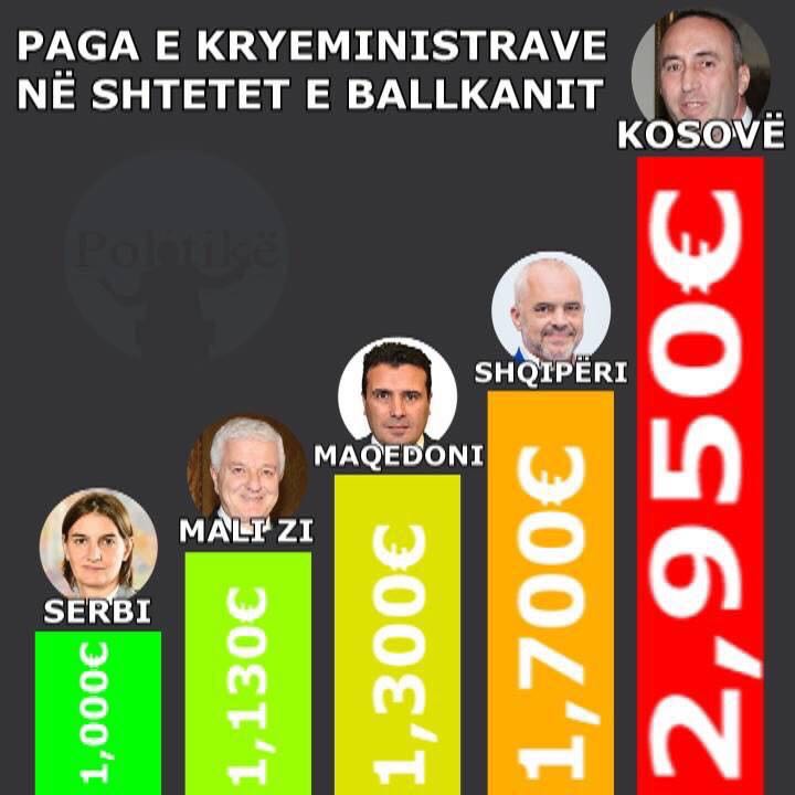 Të gjithë kryeministrat e republikave në Ballkan e kanë të zgjidhur problemin e strehimit, paga më të larta se 1,000 euro dhe disa prej tyre edhe kursime në banka. Kryeministrja e Serbisë Ana Brnabiç është më e “varfëra” nga të gjithë kolegët e saj të ish republikave jugosllave. Ajo merr një pagë mujore pak më shumë se 1,000 euro Pagë mujore jo të madhe merr edhe Kryeministri i Malit të Zi, Dushko Markoviç. Paga e tij është 1.130 euro, por nga vlerësimet jozyrtare ai është ndoshta më i pasuri nga të gjithë kolegët e tij të rajonit.