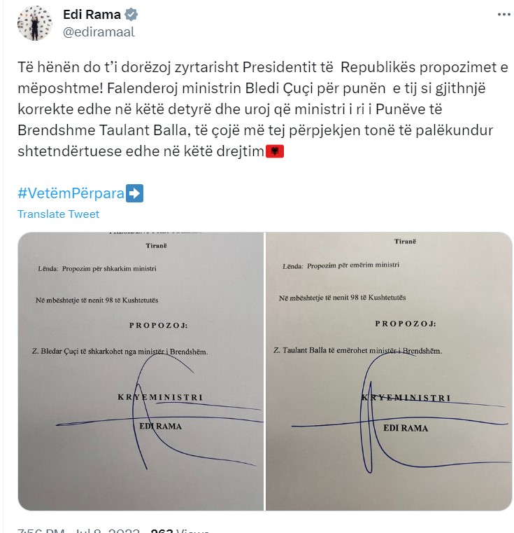 Të hënën do t’i dorëzoj zyrtarisht Presidentit të Republikës propozimet e mëposhtme! Falenderoj ministrin Bledi Çuçi për punën e tij si gjithnjë korrekte edhe në këtë detyrë dhe uroj që ministri i ri i Punëve të Brendshme Taulant Balla, të çojë më tej përpjekjen tonë të palëkundur shtetndërtuese në çdo drejtim.