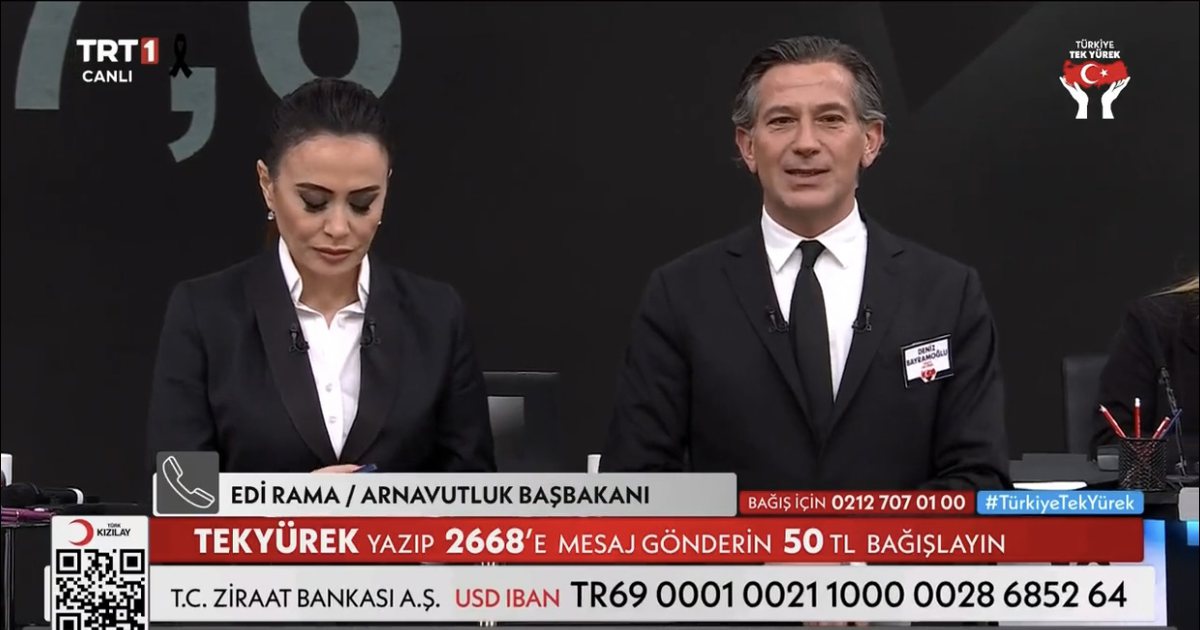“Faleminderit që më bëtë pjesë, jam shumë i nderuar të sjell në televizionin tuaj zërin e sensibilizimit të Shqipërisë. Shqipëria ka patur një ditë zie, me flamurin tonë në gjysmështize, për të shprehur solidaritet për këtë tragjedi. Ne kemi qenë sa më të shpejtë që mundëm të dërgojmë ekipet e shpëtimit. Nuk do ta harrojmë kurrë atë që Turqia dhe Erdogan bënë pas tërmetit në 2019-ën, dhe kemi vendosur të mbështesim popullin turk. Shpresojmë se familjet turke do ta kalojnë këtë falë solidaritetit. Shqipëria në emër të qytetarëve shqiptarë do të dhurojë 1 milionë euro. E dimë që nevojiten shumë më tepër, por jemi pranë jush dhe japim çfarë të mundemi”, tha kryeministri Rama gjatë telefonatës me ogranizatorët në studio.