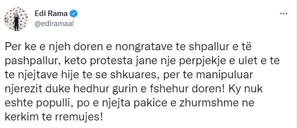 Përmes një postimi në twitter, Rama shkruan se këto protesta janë përpjekje e ulët e të njëjtave hije të së shkuarës, dhe pas tyre qëndrojnë të shpallurit non-grata. Sipas tij qytetarët në protestë nuk janë populli, por një pakicë që kërkon rrëmuja.