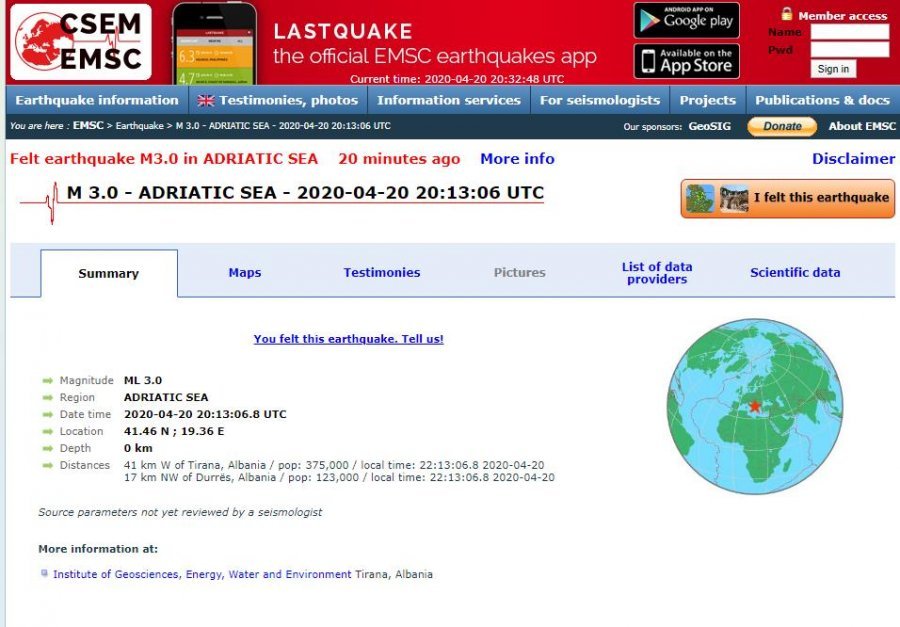 Disa lëkundje tërmeti janë regjistruar pasditen e sotme në Detin Adriatik, fatmirësisht jo të madh për të krijuar panik tek qytetarët. Lëkundja më e fortë është regjistruar rreth orës 22:13 minuta të mbrëmjes së sotme. Sipas Emsc, tërmeti ka një magnitudë prej 3.0 rreth 17 km në veriperëndim të Durrësit.