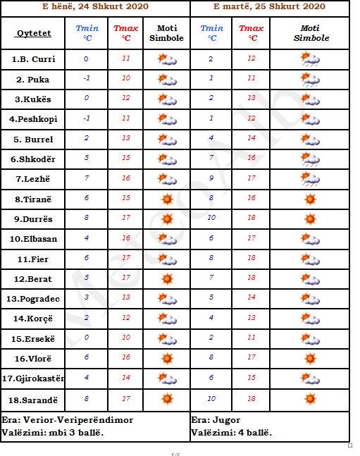 Sipas Meteoalb, temperaturat do të pësojnë një rritje të lehtë ku do të variojnë: në zonat malore, nga 01ºC në 11ºC, në zonat e ulëta nga 06ºC në 17ºC dhe në zonat bregdetare nga 10°C në 18ºC.