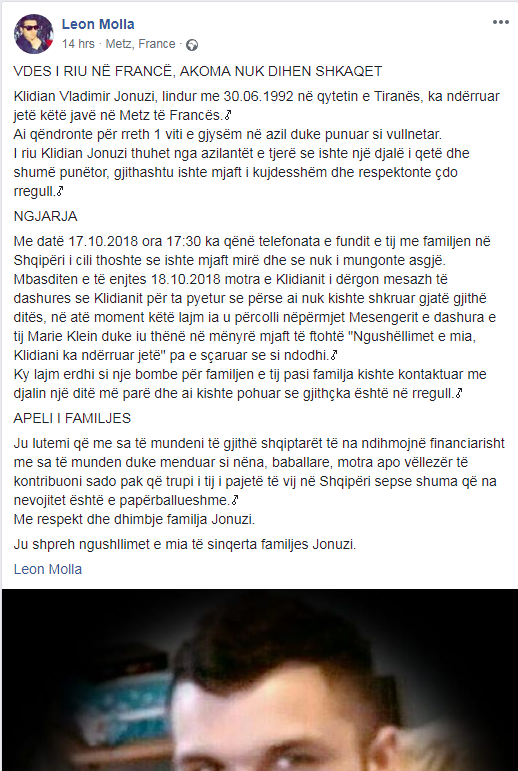 Ndërkohë familja e tij bën apel për ndihmë për të kontribuuar që familja të kthejë trupin e të riut në vendlindje. “Ju lutemi që me sa të mundeni të gjithë shqiptarët të na ndihmojnë financiarisht me sa të munden duke menduar si nëna, baballarë, motra apo vëllezër të kontribuoni sado pak që trupi i tij i pajetë të vij në Shqipëri sepse shuma që na nevojitet është e papërballueshme”, apelon familja Jonuzi.