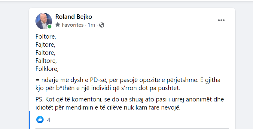 PS. Kot që të komentoni, se do ua shuaj ato pasi i urrej anonimët dhe idiotët për mendimin e të cilëve nuk kam fare nevojë”, shkruan Bejko në Facebook.
