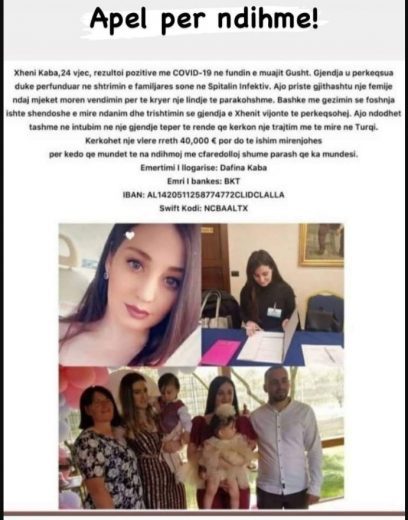 Koronavirusi vijon të godasë të rinjtë, ku rasti më i fundit është i 24-vjeçares Xheni Kaba, e cila gjendet e intubuar prej disa ditësh. Kjo e fundit ishte shtatëzënë dhe me përkeqësimin e gjendjes, mjekët vendosën që të bëjnë lindje të parakohshme. Nga dita në ditë gjendja e saj u përkeqësua. E reja është nisur sëfundmi në Turqi për kurim më të specializuar. Të afërmit e saj kanë bërë thirrje publike për ndihme nga qytetarët pasi mendohet se kurimi do t’i kushtojë rreth 40 mijë euro, të cilat ata nuk i kanë. Krahas nisjes së Xhenit jashtë shtetit, lajmi tjetër i mirë në këtë rast është se foshnja gëzon shëndet të plotë dhe gjendet nën kujdesin e familjarëve.