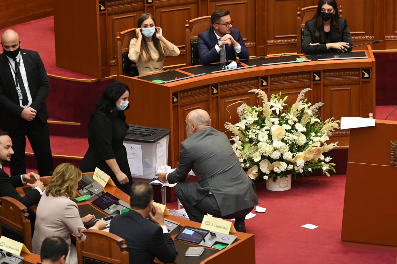 Edi Rama nuk e ka humbur as këtë rast për të provokuar ose për t’u dukur në nisje të seancës së parë të legjislaturës së re të Kuvendit. Kur i erdhi radha e votimit, Rama u grit dhe pasi mori fletën e votimit, nisi të mblidhte letrat në tokë që kishin lënë deputetët e PD-së. Në bllok ata i grisën fletët e votimit për Lindita Nikollën duke shprehur kështu një lloj proteste ose mosdakordësi. Kryeministri porositi një nga të vetët që t’i sillte një qese plastike. Pasi i mblodhi letrat, i futi në një qese, të cilën më pas e mori me vete. Por PD protestoi duke thënë se ato janë material votimi dhe s’mund të merren. Pas disa sekondash, Rama cohet sërish nga vendi dhe ia jep qesen Belind Këllicit që ishte në komisionin e votimit. Më pas qesen e merr Alfred Rushaj, për ta zbrazur sërish aty ishin hedhur nga deputetët e PD-së që prej nisjes së votimit.