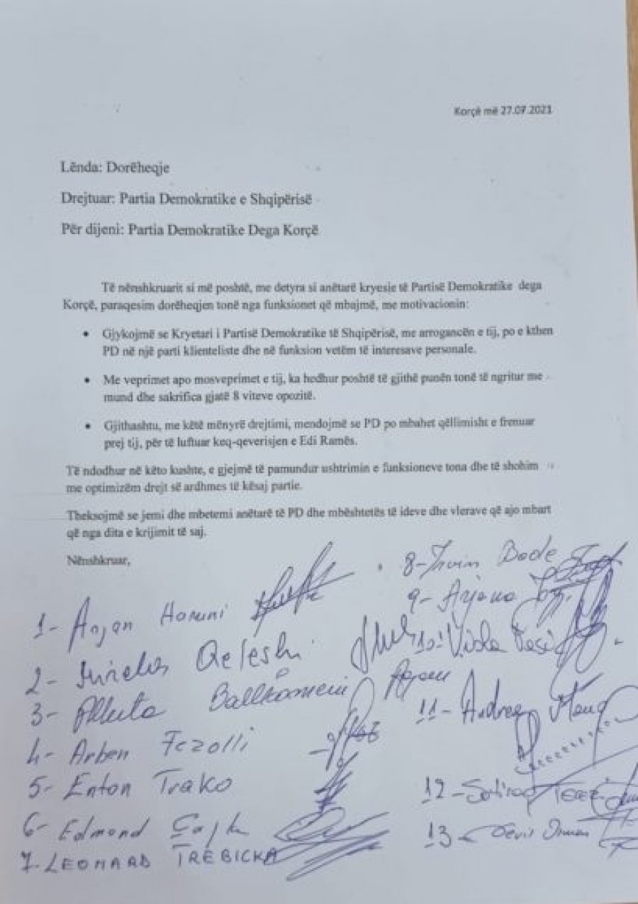 Nisur nga sa ka ndodhur dhe po ndodh me drejtimin e Partisë demokratike të shqipërisë, kemi dalë sot para jush dhe para opinionit publik, si anëtarë të kryesisë të Partisë Demokratike dega Korçë, për të dhënë dorëheqjen tonë nga funksionet drejtuese që mbajmë.