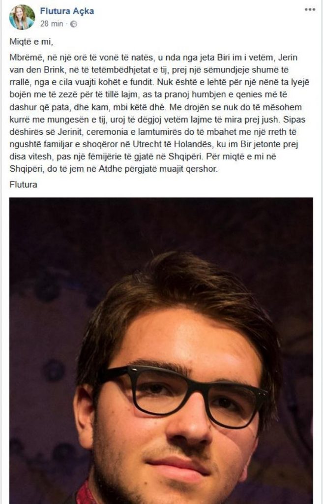 Mbrëmë, në një orë të vonë të natës, u nda nga jeta Biri im i vetëm, Jerin van den Brink, në të tetëmbëdhjetat e tij, prej një sëmundjeje shumë të rrallë, nga e cila vuajti kohët e fundit.