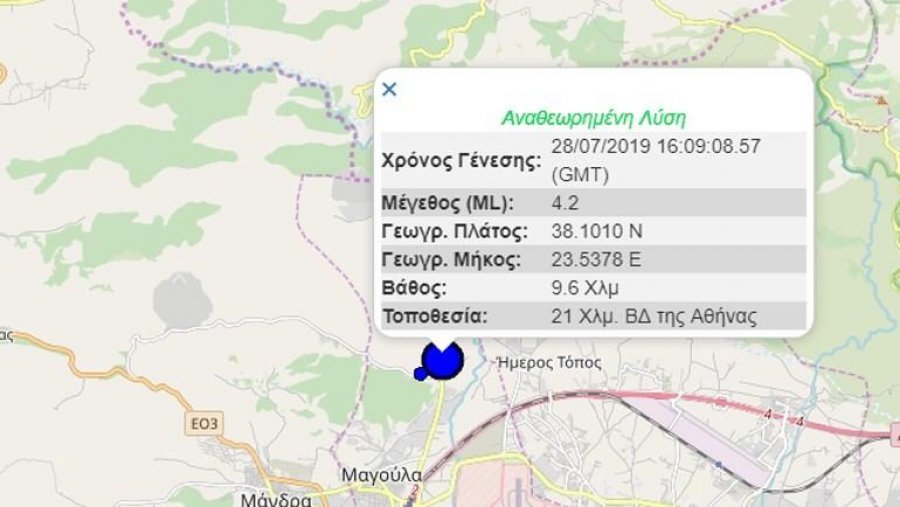 Epiqendra e tërmetit ndodhet 21 km në veriperëndim të Athinës dhe thellësia fokale vlerësohet në 9.6 km, sipas studimit të rishikuar të Institutit Gjeodinamik të Observatorit Kombëtar të Athinës.