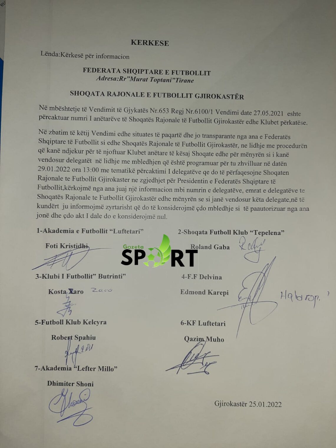 Shoqata Rajonale Gjirokastër kërkesë FSHF-së: Na jepni emrat e delegatëve që do votojnë në zgjedhje, çdo veprim që nuk ka autorizimin tonë do jetë nul (Faksimile)