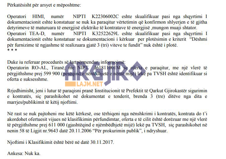 Oferta e paraqitur nga kjo kompani, me një vlerë të përgjithshme prej 599 900 (pesëqind e nëntëdhjetë e nëntë mijë) lekë pa TVSH është identifikuar si oferta e suksesshme. ArgjiroLajm.net sjell më poshtë dokumente që tregojnë më shumë detaje rreth përzgjedhjes së kompanisë fituese, e cila do të bëjë mobilimin e zyrës së prefektit Astrit Aliaj dhe institucionit që ai drejton.