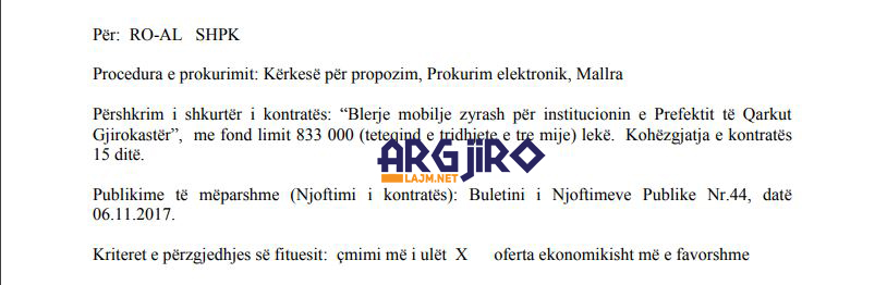 Prefektura Gjirokastër ka shpallur fituesin e tenderit me objekt ‘Blerje mobilje zyrash’, me fond limit rreth 10 milionë lekë të vjetra me tvsh. Ky tender ishte hedhur pak ditë pasi prefekti i ri i qarkut, Astrit Aliaj, kishte marrë detyrën. Kompania e shpallur fituese është ‘ RO-AL’, Tiranë.