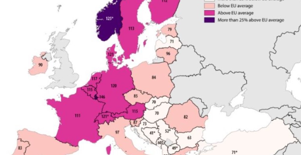 PBB për frymë varionte nga 55% e mesatares së BE-së në Bullgari në 277% në Luksemburg
