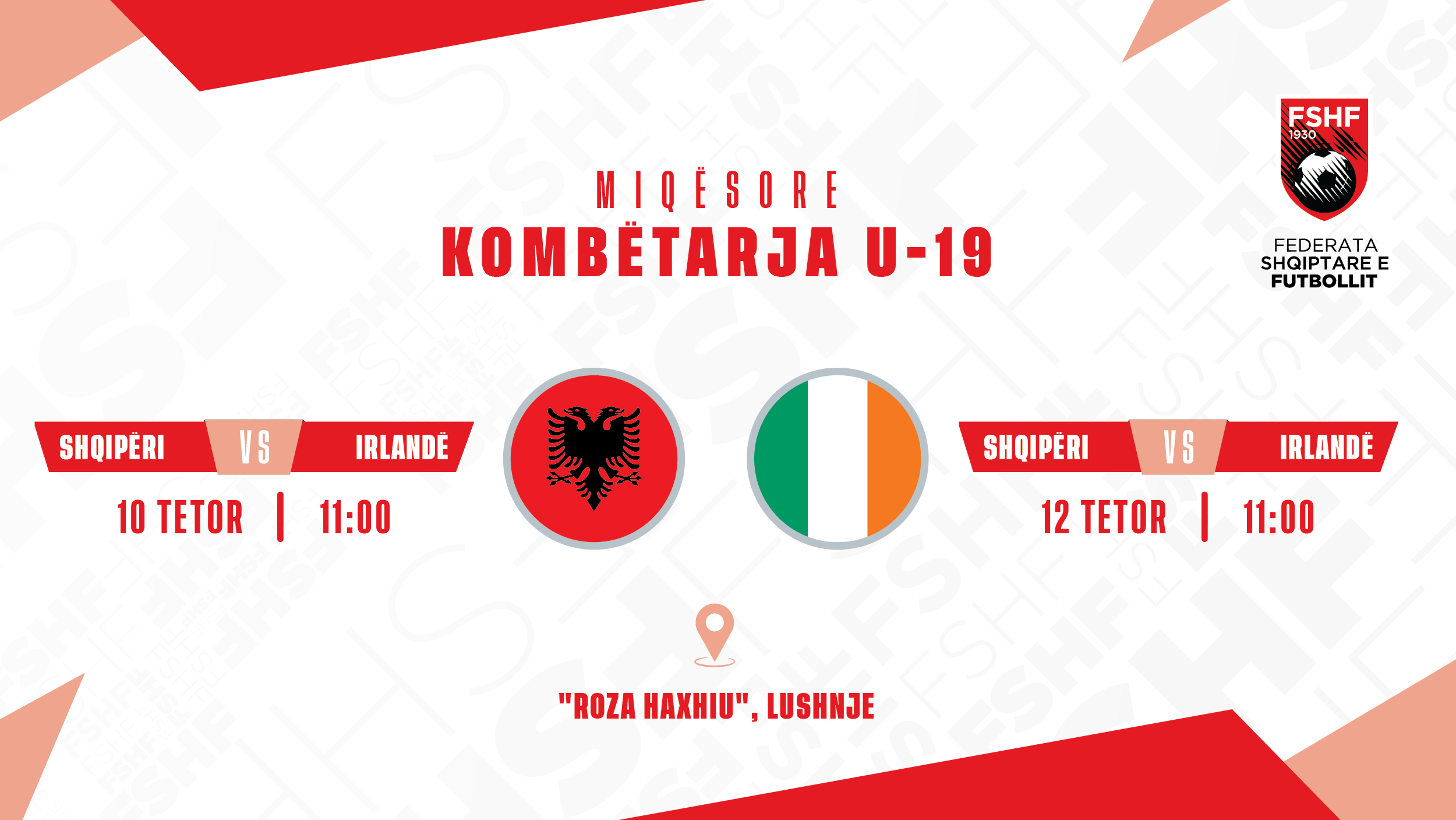 Kuqezinjtë e drejtuar nga trajneri Julian Ahmati do të përballen me irlandezët më 10 dhe 12 tetor, në stadiumin “Roza Haxhiu” të Lushnjes dhe të dyja sfidat janë planifikuar të nisin në 11:00.