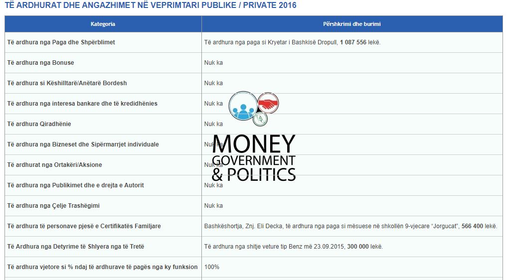 Të ardhura nga paga si Kryetar i Bashkisë Dropull, 1 087 556 lekë.