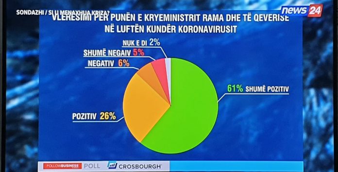 Sipas një sondazhi nga Eduart Zaloshnja në lidhje me punën e Kryeministrit Edi Rama dhe të qeverisë për përballimin e situatës kundër koronavirusit kanë votuar: