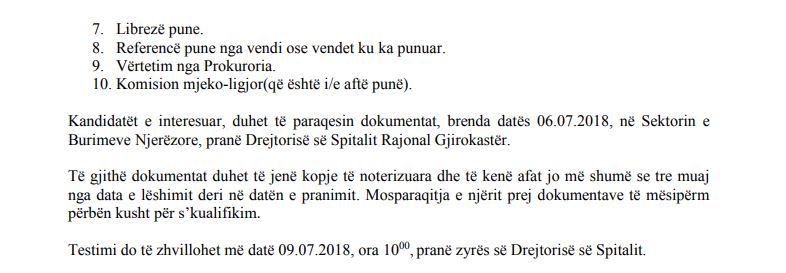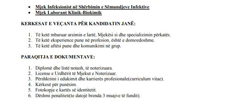 Spitali rajonal ‘Omer Nishani’ në Gjirokastër shpall njoftimin për dy vende të lira pune në pozicionet: Mjek Infeksionist në Shërbimin e Sëmundjeve Infektive dhe Mjek Laborant Klinik-Biokimik. Ndonëse afati për dorëzimin e aplikimeve ka qenë deri më datë 6 të këtij muaji, vendet janë ende vakante dhe kandidatët e interesuar mund të aplikojnë. Më poshtë njoftimi i plotë.