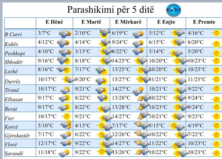 Nuk do të mungojnë reshjet e dëborës me intensitet të ulët e lokalisht deri mesatar në relievet malore në veri, verilindje-juglindje të vendit në lartësitë mbi 1000m, kryesisht ditën e Hënë dhe të Enjte.