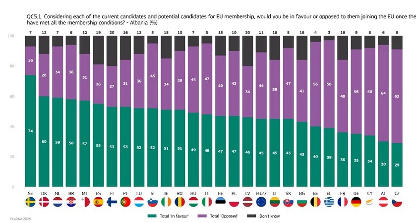 Vendet që e preferojnë më së shumti Shqipërinë në BE janë Suedia 74%, Danimarka 60%, Holanda 59%.