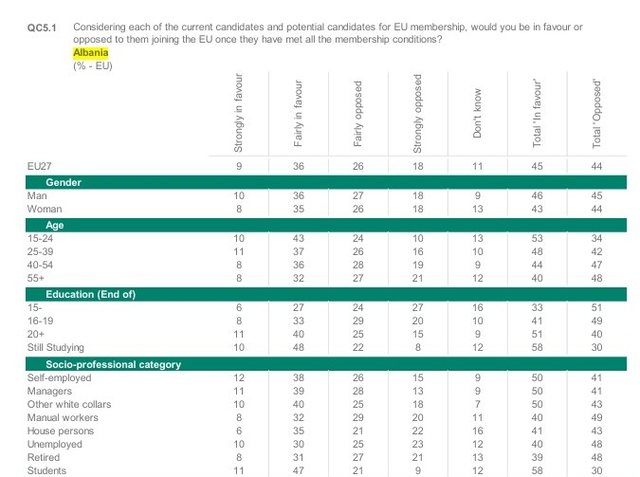 45% e qytetarëve të Bashkimit Europian janë pro anëtarësimit të Shqipërisë në bllok, sipas matjeve të fundit nga Eurobarometri.