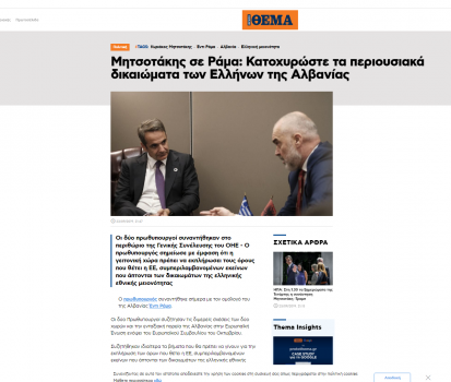 Në veçanti, kryeministri Mitsotakis theksoi çështjen e vetëvendosjes dhe të drejtat pronësore të pakicës etnike Greke në Shqipëri. Në këtë kontekst, Rama shprehu gatishmërinë e tij për të bashkëpunuar me Greqinë për çështje me interes të veçantë për vendin tonë. Mitsotakis pohoi se ishte në favor të perspektivave të pranimit të Ballkanit Perëndimor, me kusht që të përmbusheshin të gjitha kushtet e përcaktuara nga Bashkimi Evropian.