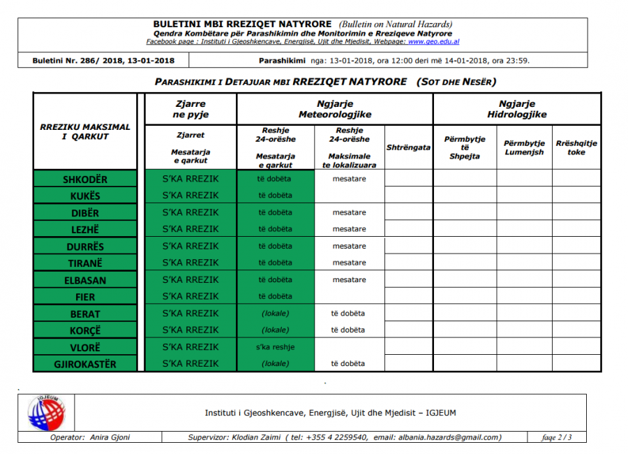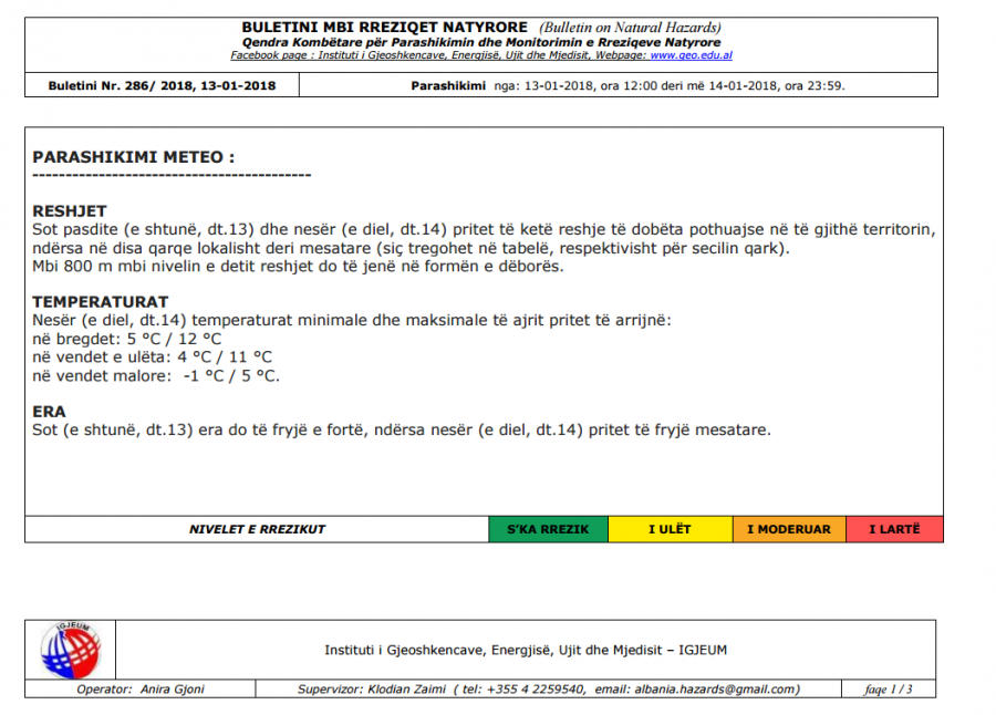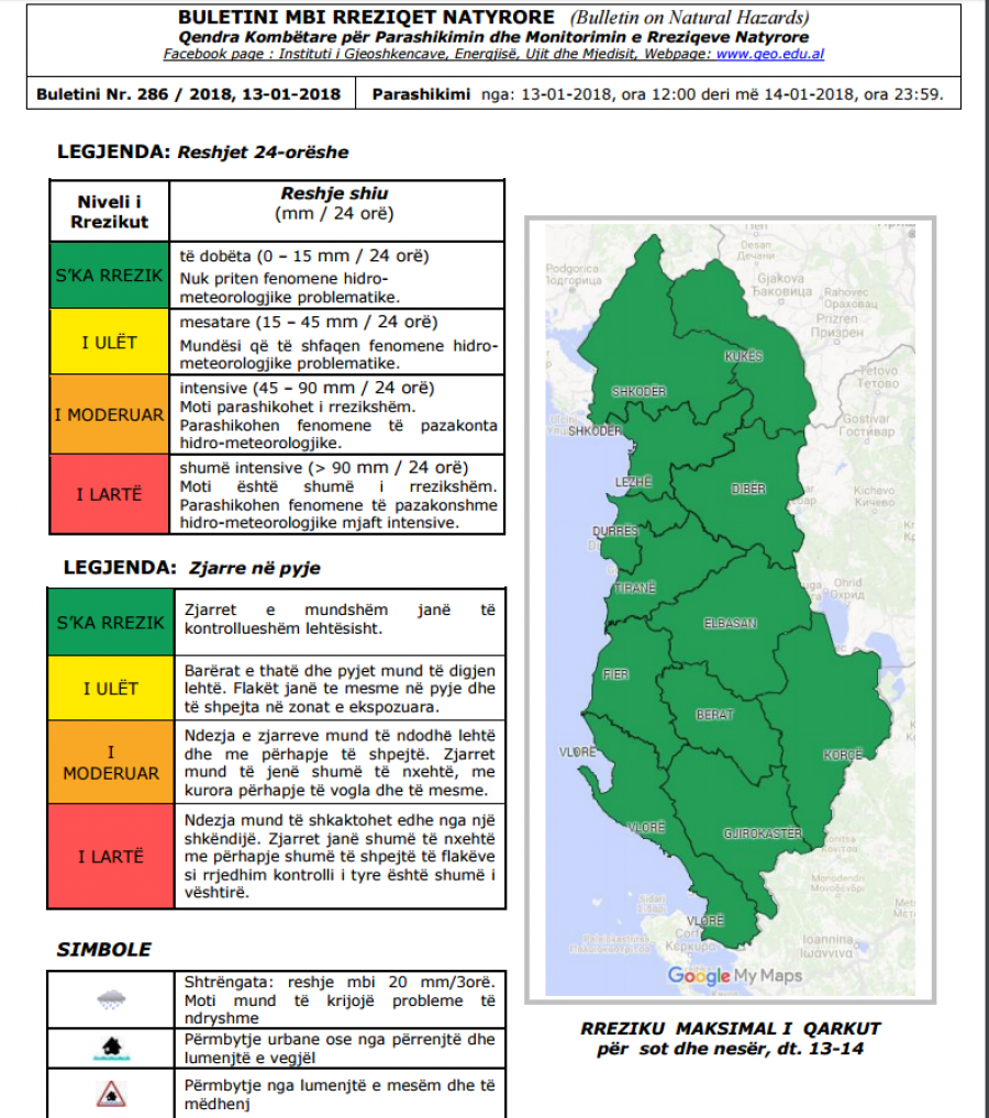 Sot pasdite dhe të hënëb, datë 15 janar 2018 pritet të ketë reshje në të gjithë territorin. Reshjet priten të jenë të dobëta deri mesatare, ndërsa në disa qarqe lokalisht deri intensive, të shoqëruara edhe me shtrëngata (siç tregohet në tabelë, respektivisht për secilin qark).