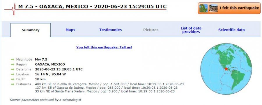 Një tërmet i frikshëm ka tronditur pak minuta më parë Meksikën. Sipas asaj që raporton EMSC, lëkundjet sizmike kanë qenë me magnitudë 7,5 ballë të shkallës rihter. Ndërsa autoritetet amerikane flasin për 7.7 ballë. Epiqendra e lëkundjeve ka qenë 33 km në veri-lindje të Santa Maria Xadani, një lokalitet i vogël me rreth 6 mijë banorë në qendër të shtetit të Amerikës Qëndrore. Deri tani nuk ka raportime për dëme në njerëz.