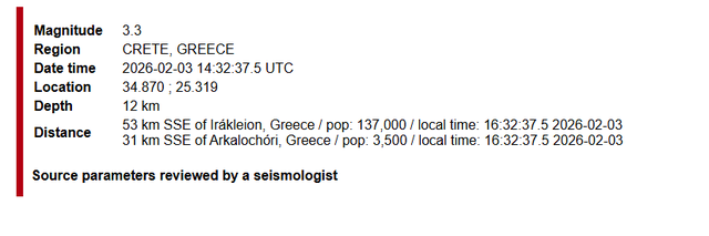 Sipas Institutit Gjeodinamik, epiqendra e tërmetit ndodhet 17 kilometra në jug të Tsoutsouros, Heraklion, dhe thellësia fokale e tij vlerësohet në 10 kilometra.