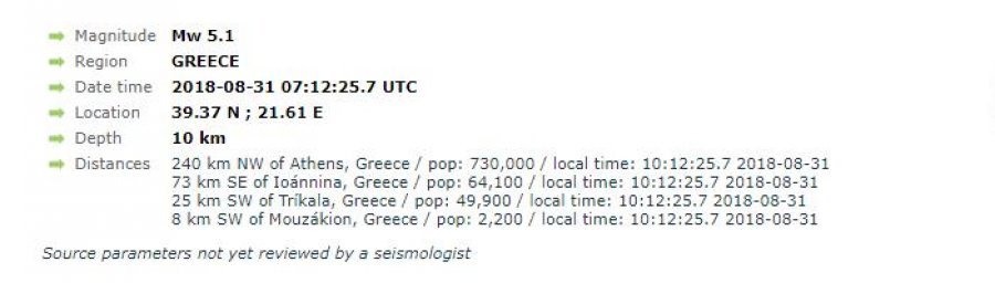 Një tërmet ka goditur Greqinë me magnitudë 5.1 ballë. Ai ra në zonën Trikalla -Karditsa në orën 7:12 min me orën universale të koordinuar ose me orën 9:12 min në vendin tonë. Lëkundjet e tij janë ndier edhe në juglindje të Shqipërisë, në Korçë, Gjirokastër etj.