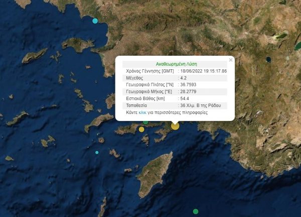 Sipas zgjidhjes së rishikuar të Institutit Gjeodinamik, epiqendra ishte 36 km në veri të Rodosit dhe thellësia fokale ishte 54.4 km.