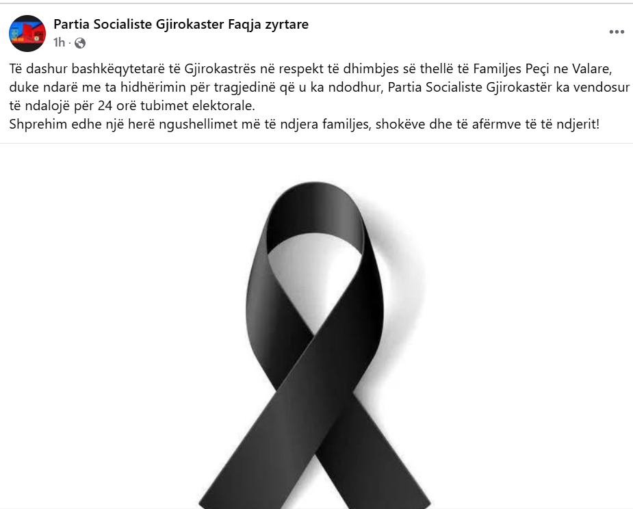 “Të dashur bashkëqytetarë të Gjirokastrës në respekt të dhimbjes së thellë të Familjes Peçi ne Valare, duke ndarë me ta hidhërimin për tragjedinë që u ka ndodhur, Partia Socialiste Gjirokastër ka vendosur të ndalojë për 24 orë tubimet elektorale. Shprehim edhe një herë ngushellimet më të ndjera familjes, shokëve dhe të afërmve të të ndjerit!”, thuhet në një njoftim të PS Gjirokastër.