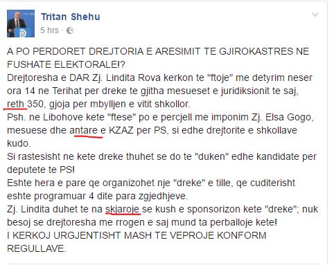 Kryesuesi i listës së kandidatëve për deputetë në Gjirokastër, Tritan Shehu, hedh dyshime për përdorim të mësuesve në fushatën elektorale. Përmes një postimi në faqen e tij në Facebook, ai flet për një drekë që Lindita Rova, drejtoresha e DAR Gjirokastër, organizon në Terihat me mësues, me rastin e përfundimit të vitit shkollor. Ja cfarë shkruan Shehu, në një shënim të mbushur plot me gabime drejtshkrimore.