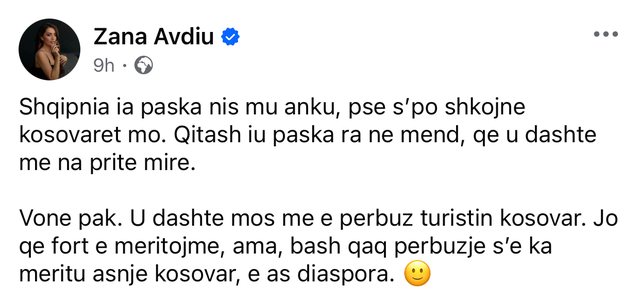 “Shqipnia ia paska nis mu anku, pse s’po shkojnë kosovarët mo. Qitash iu paska ra në mend, që u dashtë me na pritë mirë. U dashtë mos me e përbuz turistin kosovar. Jo që fort e meritojmë, ama, bash qaq përbuzje s’e ka meritu asnjë kosovar, e as diaspora,” shkruan ajo.