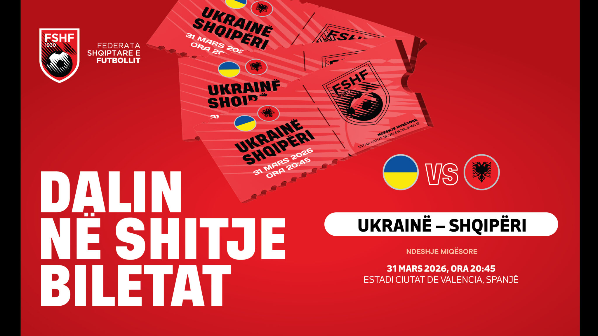 Federata Shqiptare e Futbollit njofton se kanë dalë në shitje biletat për ndeshjen miqësore mes Ukrainës dhe Shqipërisë, që do të zhvillohet më 31 mars, në orën 20:45, në stadiumin Estadi Ciutat de València, në Valencia.